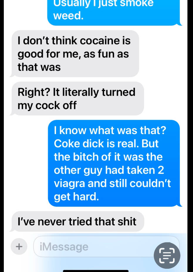 {D}’s attorney requested access to the Google Drives today. I am not at all required to give her a fucking thing at this point, so I locked it down. Along with everything else. Here I share one of the texts — I believe he denied doing cocaine in paragraph four or something of his answer.